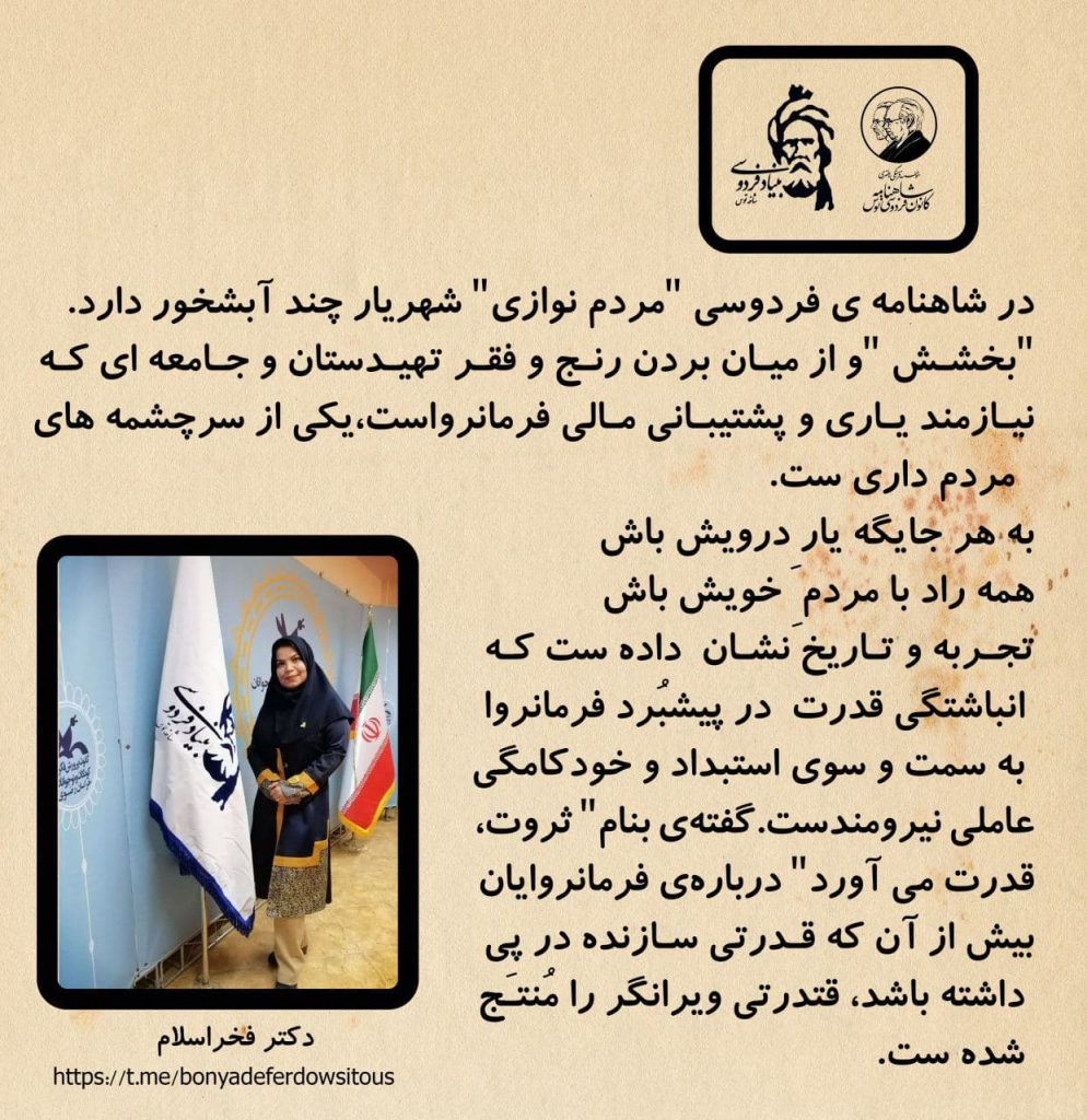 🔷در #شاهنامهی فردوسی “مردم نوازی” شهریار چند آبشخور دارد.”بخشش “و از میان بردن رنج و فقر تهیدستان و جامعه ای که نیازمند یاری و پشتیبانی مالی فرمانرواست،یکی از سرچشمه های مردم داری ست.