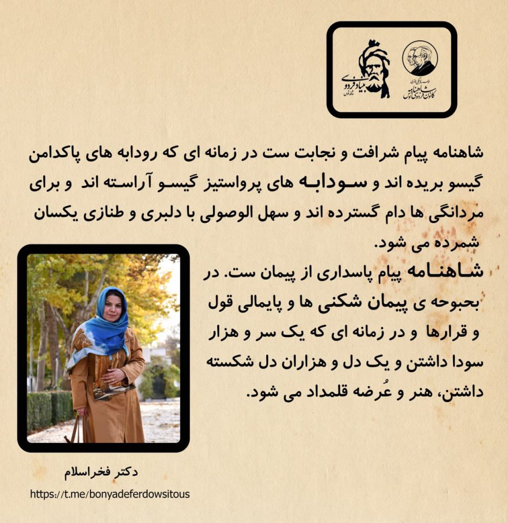 🔶شاهنامه پیام شرافت و نجابت ست در زمانه ای که رودابه های پاکدامن گیسو بریده اند و سودابه های پرواستیز گیسو آراسته اند و برای مردانگی ها دام گسترده اند و سهل الوصولی با دلبری و طنازی یکسان شمرده می شود.