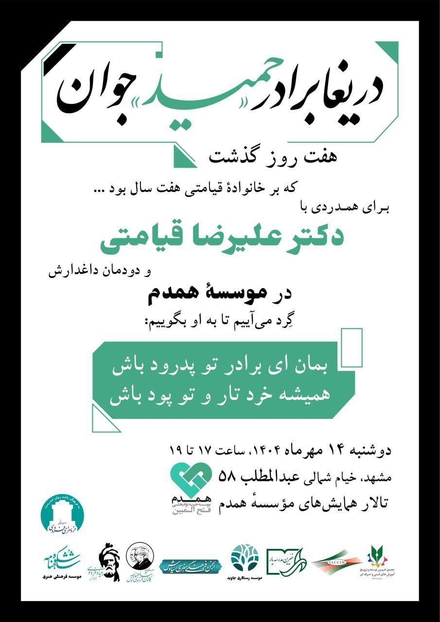 برای همدردی با دکتر علیرضا قیامتی و دودمان داغدارش در موسسۀ همدم گرد میآییم تا به او بگوییم:
