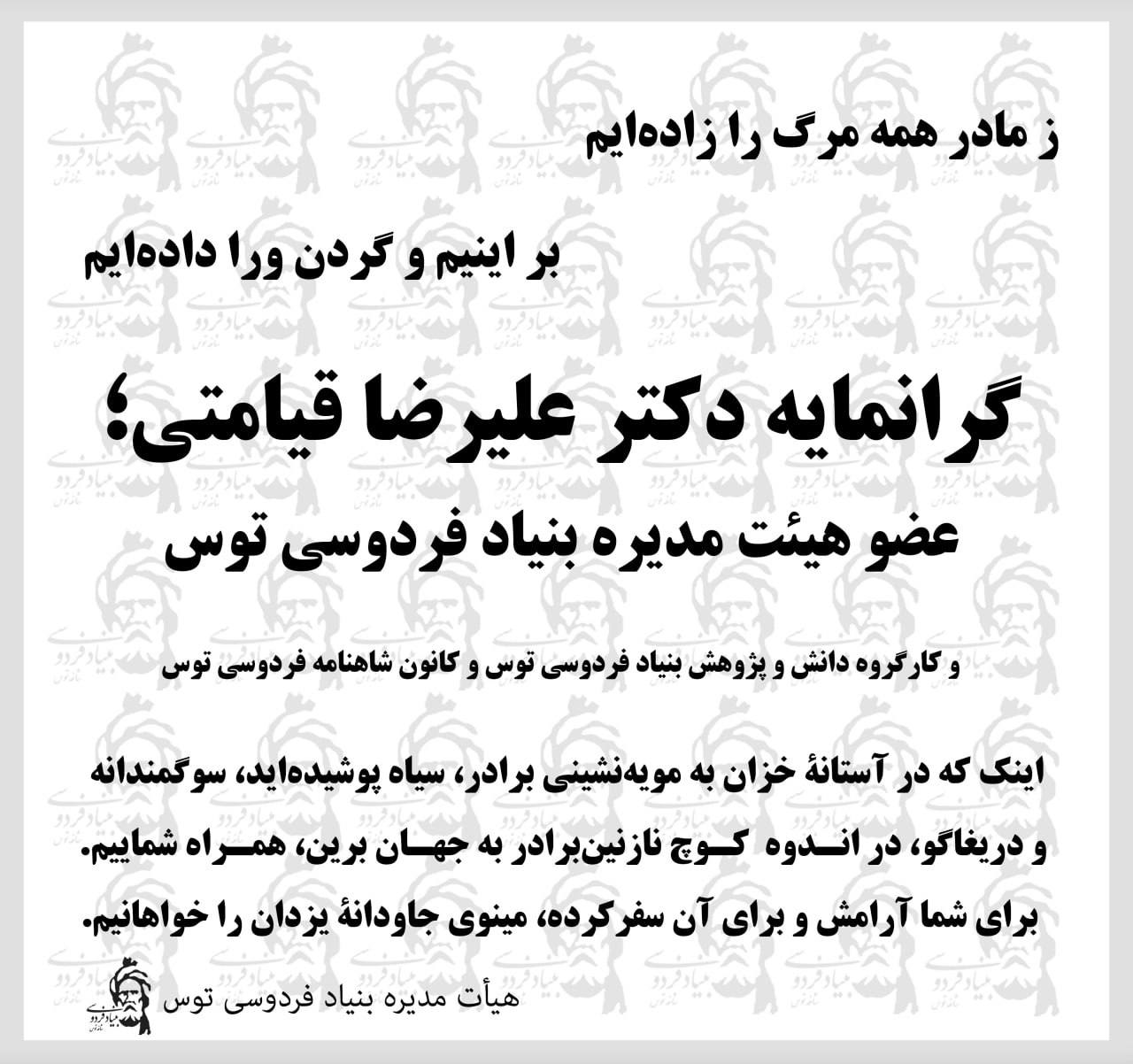 اینک که در آستانۀ خزان به مویه‌نشینی برادر، سیاه پوشیده‌اید، سوگمندانه و دریغاگو، در اندوه کوچ نازنین‌برادر به جهان برین، همراه شماییم. برای شما آرامش، و برای آن سفرکرده، مینوی جاودانۀ یزدان را خواهانیم.